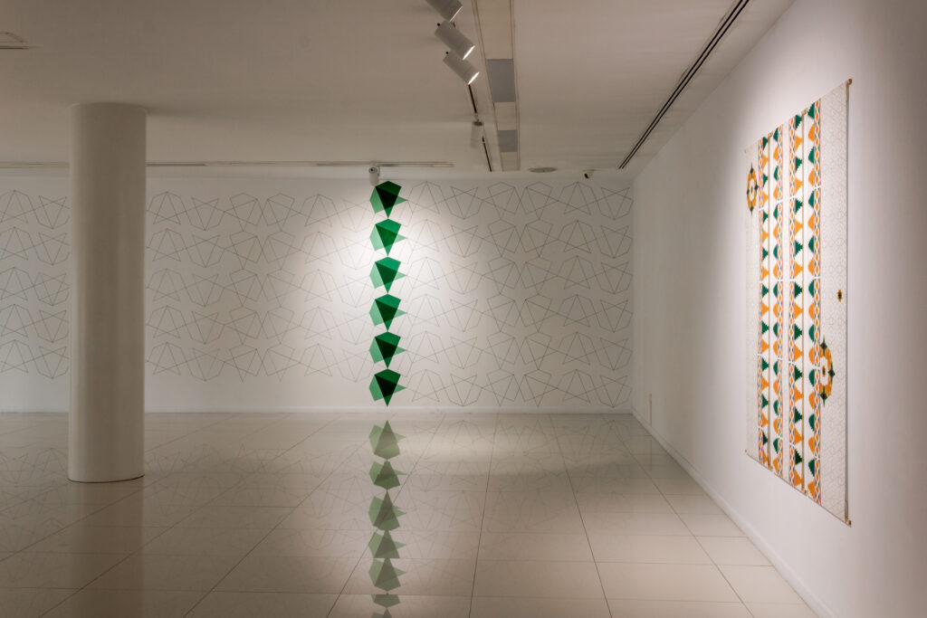 Estas formas se transforman y evolucionan a partir de la repetición y el error del proceso manual, del afán de abstracción del ornamento. La pintura sobre telas de gasa semitransparente se expande hacia los muros, la cerámica y la forja. La instalación ocupa el espacio y lo transforma de manera que permite al espectador transitar la pintura en el espacio decorado, instalado, y observar diferentes puntos de vista. Nos invita a posicionarnos en el espacio y ante la pintura de una manera diferente, a formular otra lectura del acto instalativo y a través del ornamento como impulsor de la salida de la pintura fuera del marco.