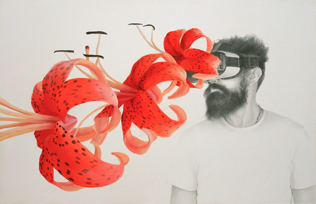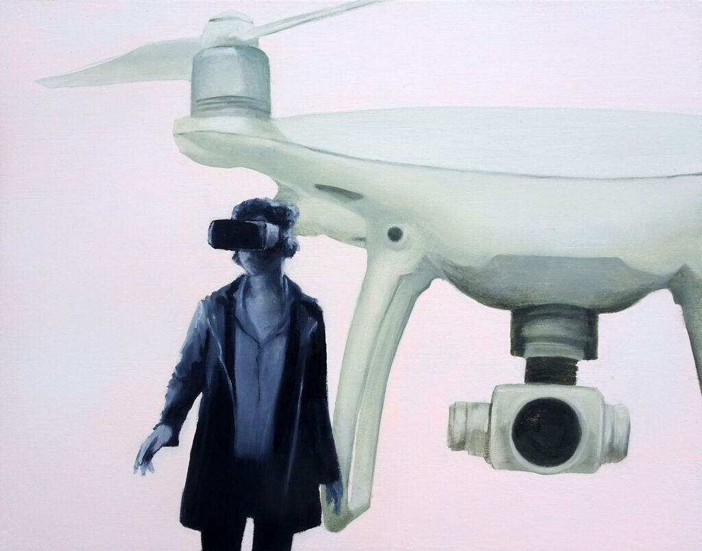 Los protagonistas de sus obras comparecen provistos de unas gafas de realidad virtual tras la que ocultan parte de su cara y todo su pensamiento y atención, unas piezas donde la figura humana se va desdibujando, se va apagando, va perdiendo su forma y su color, se desmaterializa, se convierte en un fantasma que vaga en medio de unos paisajes que van ganando protagonismo, que van absorbiendo conciencia. Personajes alienados, desprovistos de voluntad, como si habitaran otra realidad y lo que viéramos aquí fuera tan sólo un reflejo de su propia presencia.