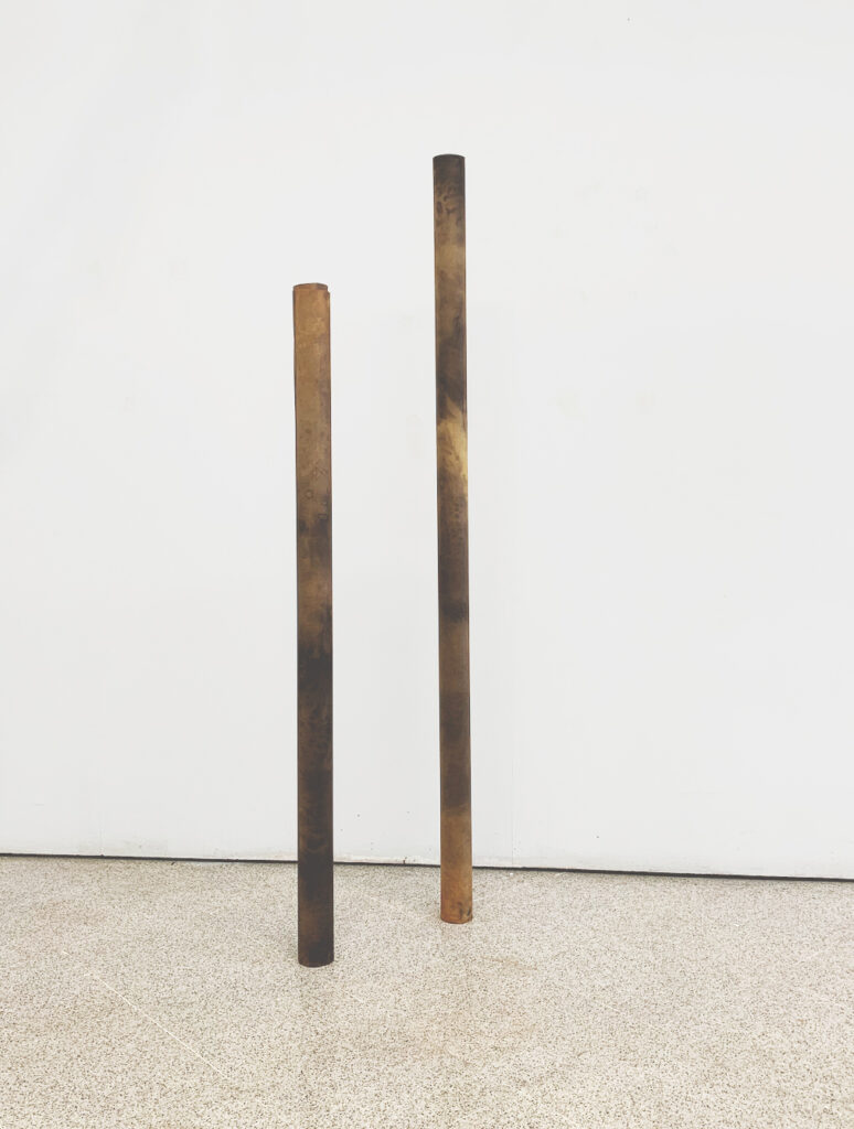 Mar Cubero porSin Título. Instalación. Se trata de dos piezas con las que el artista quiere lograr un equilibrio entre lo natural y lo procesado, entre el material empleado y la obra resultante, siempre operando desde las cuestiones propias de las escultura y el espacio.