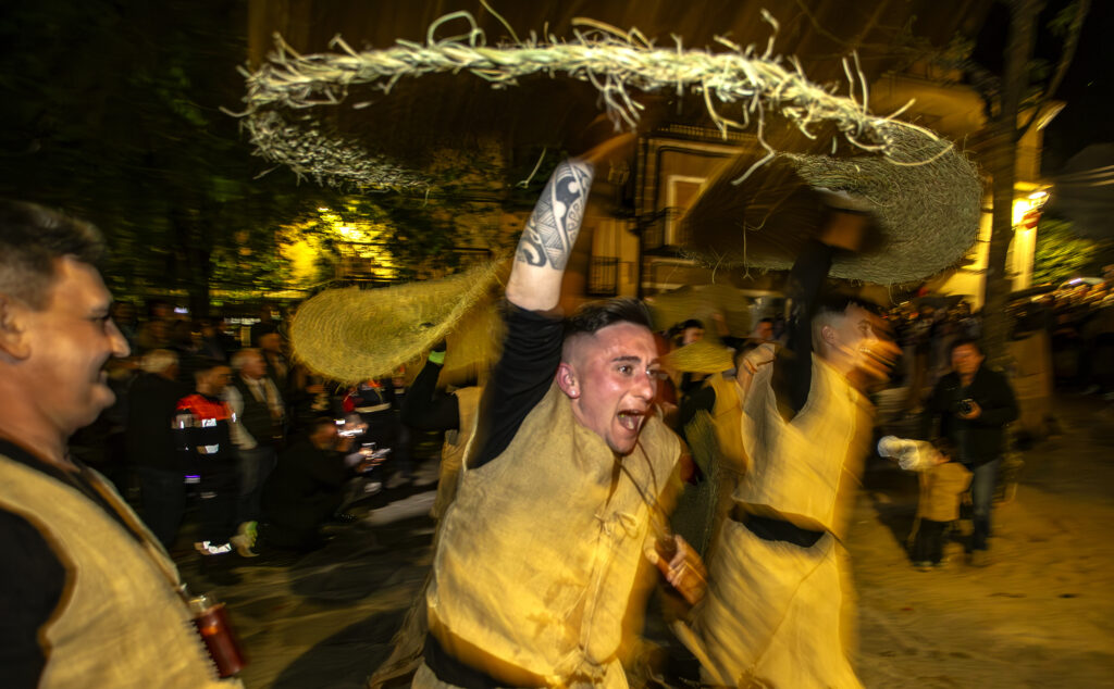 Una potente instantánea que capta todo el movimiento y la emoción de uno de los momentos álgidos de la fiesta de El Capazo, en Torre Don Miguel, justo cuando los capaceros lanzan las esteras con la intención de dejarlas enganchadas en el árbol antes de que prenda en llamas.